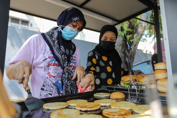 Peniaga burger Sharifah Rokiah Syed Harun (kanan) bersama pembantunya Nooranisha Syed menyiapkan tempahan pelanggan selepas Majlis Pelancaran Burgernita anjuran Yayasan MRCB di Seri Kembangan, Subang Jaya pada 9 Ogos 2022. Foto HAFIZ OTHMAN/SELANGORKINI
