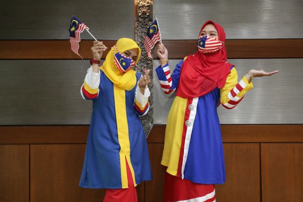 Penjawat awam Salwa Shahirah (kanan) bersama Faujiah Endon mengayakan baju bertemakan Jalur Gemilang ketika perhimpunan bulanan Pejabat Tanah Dan Galian Negeri Selangor di Bangunan Annex Dewan Negeri Selangor, Shah Alam pada 9 Ogos 2022. Foto FIKRI YUSOF/SELANGORKINI