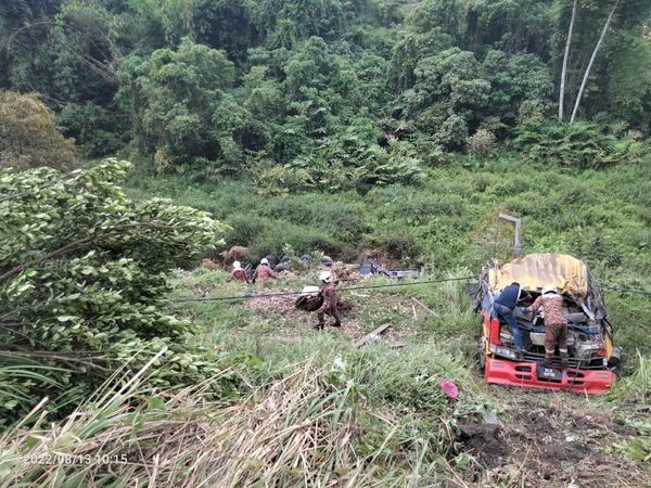 GERIK, 13 OGOS: Seorang lelaki maut selepas treler muatan konkrit yang dipandunya terbabas ke dalam gaung di Gunung Paku, Klian Intan dekat Pengkalan Hulu di sini, hari ini.