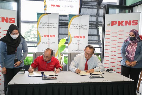 Ketua Pegawai Eksekutif PKNS, Dato' Mahmud Abbas (dua, kanan) bersama Ketua Pegawai Perniagaan Kumpulan Runcit Bank Islam, Mizan Masram (dua, kiri) menandatangani Memorandum Persefahaman (MoU) antara Perbadanan Kemajuan Negeri Selangor PKNS dan Bank Islam di Restoran SACC Kelana Seafood, Shah Alam pada 15 Ogos 2022. Foto FIKRI YUSOF/SELANGORKINI