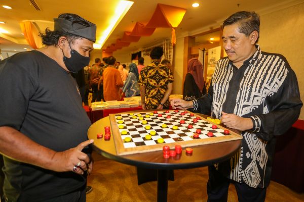 Ahli Jawatan Kuasa Kelab Dam Haji Hulu Langat Daud Dahlan (kiri) bermain dam haji di gerai pamerannya bersama tetamu yang hadir ketika Majlis Perasmian Sesi Penilaian Kebangsaan Gombak - Hulu Langat Geopark 2022 di Grand Barakah Hotel, Ampang Jaya pada 16 Ogos 2022. Foto HAFIZ OTHMAN/SELANGORKINI