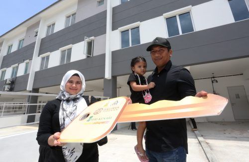 Nik Mohd Mustaqim Nik Zubir dan isteri Noor Atika Noor Azlan gembira setelah menerima replika kunci sempena Majlis Penyerahan Kunci Rumah Selangorku Seri Kenari, Saujana Perdana di Sungai Buloh pada 23 Ogos 2022. Foto AHMAD ZAKKI JILAN/SELANGORKINI