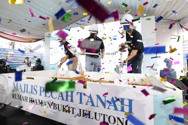 Dato’ Menteri Besar Dato’ Seri Amirudin Shari (tengah) bersama Ketua Pegawai Eksekutif Permodalan Negeri Selangor Berhad (PNSB) Raja Ahmad Shahrir Iskandar Raja Salim (kanan) dan Pengerusi Gagasan Nadi Cergas Berhad Ir Dr Muhamad Fuad Abdullah melakukan simbolik perasmian majlis pecah tanah Rumah Idaman Bukit Jelutong di Galeri Jualan Rumah Idaman Bukit Jelutong, Shah Alam pada 26 Ogos 2022. Foto FIKRI YUSOF/SELANGORKINI