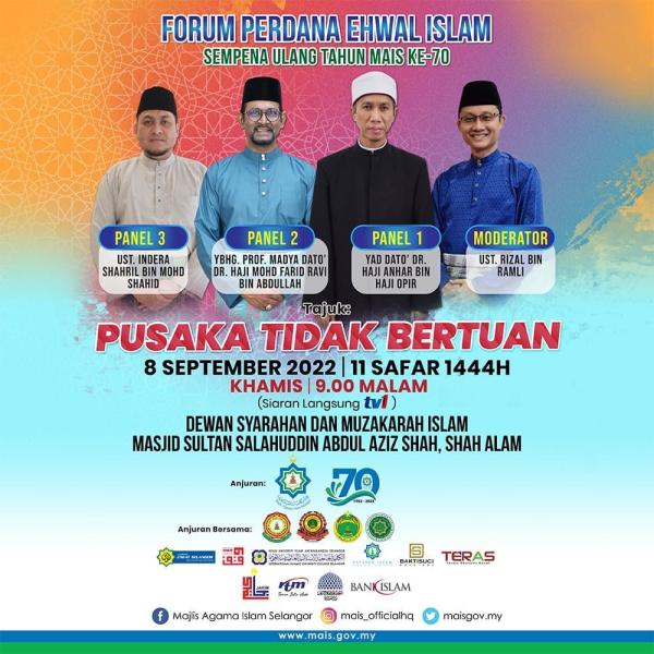 SHAH ALAM, 5 SEPT: Majlis Agama Islam Selangor (Mais) menganjurkan Forum Perdana Hal Ehwal Islam yang bakal mengupas topik ‘Pusaka Tidak Bertuan’ pada 8 September ini.