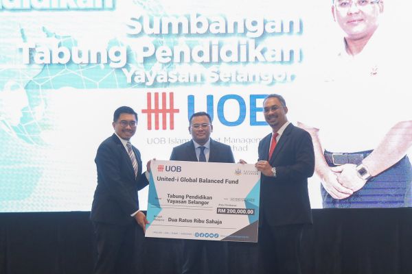 Ketua Pegawai Eksekutif Yayasan Selangor Eddie Ahmad Khodzali (kiri) menerima cek cura berjumlah RM200,000 daripada Ketua Pegawai Eksekutif UOB Pengurusan Aset Islamik Suhazi Reza Selamat (kanan) sambil disaksikan Dato’ Menteri Besar Dato’ Seri Amirudin Shari (tengah) sempena program Sinergi Pendidikan Yayasan Selangor di pusat pentadbiran rasmi Kerajaan Negeri pada 5 September 2022. Foto REMY ARIFIN/SELANGORKINI