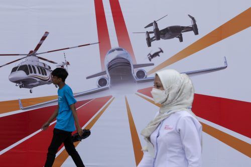 Pelawat berjalan dihadapan poster Pameran Udara Selangor (SAS) 2022 di Pusat Penerbangan Wilayah Skypark (Skypark RAC), Subang Jaya pada 8 September 2022. Foto FIKRI YUSOF/SELANGORKINI