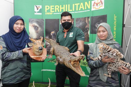 Pempamer menunjukkan haiwan yang telah diawet di gerai pameran Jabatan Perhilitan Selangor ketika program penanaman pokok sempena Hari Hutan Antarabangsa Peringkat Negeri Selangor di kaki Bukit Broga, Hulu Langat pada 24 September 2022. Foto FIKRI YUSOF/SELANGORKINI