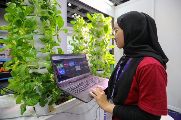 Kakitangan Havva Agrotech Nur Alia Hanani Mohd Baktiar sedang memantau sistem aquapobik ketika Sidang Kemuncak Peniagaan Antarabangsa Selangor (SIBS) di Pusat Konvensyen Kuala Lumpur (KLCC) pada 7 Oktober 2022. Foto HAFIZ OTHMAN/SELANGORKINI