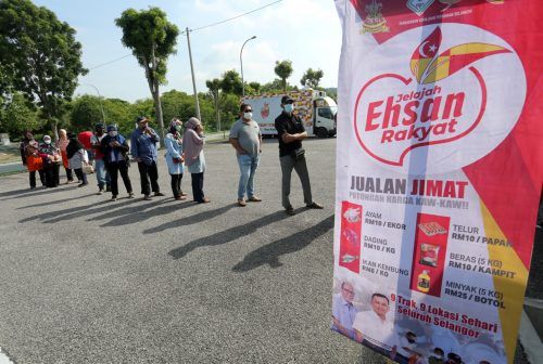 Orang ramai beratur untuk membeli barangan keperluan asas yang dijual murah berbanding harga pasaran menerusi program Jelajah Ehsan Rakyat DUN Jeram di Dewan Majlis Daerah Kuala Selangor (MDKS) Desa Coalfields, Kuala Selangor pada 11 Oktober 2022. Foto AHMAD ZAKKI JILAN/SELANGORKINI