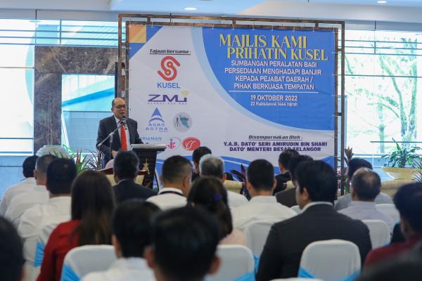 EXCO Infrastruktur dan Kemudahan Awam Ir Izham Hashim bergambar bersama selepas menyerahkan sumbangan kelengkapan peralatan menghadapi bencana banjir kepada pihak berkusa tempatan dan pejabat daerah dan tanah ketika Majlis Kami Prihatin Koridor Utiliti Selangor (KUSEL) di Bangunan Pentadbiran Kerajaan Negeri, Shah Alam pada 19 Oktober 2022. Foto HAFIZ OTHMAN/SELANGORKINI[/caption]