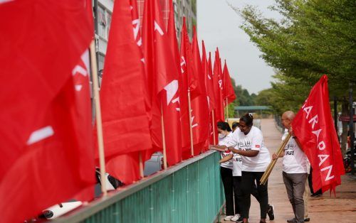 Sangeetha (kiri) dan Billy Sun (kanan) memasang bendera HARAPAN ketika Majlis Pelancaran Bilik Gerakan Pakatan Harapan Bangi di Bandar Baru Bangi, Kajang pada 3 November 2022. Foto AHMAD ZAKKI JILAN/SELANGORKINI
