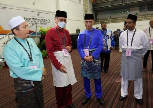 Calon Pakatan Harapan (HARAPAN) Datuk Seri Dr Dzulkefly Ahmad (dua, kiri) bersama lawannya Mohd Noor Mohd Sahar dari Perikatan Nasional (kiri), Tengku Datuk Seri Zafrul Tengku Abdul Aziz Barisan Nasional (dua, kanan) dan Mohd Shaid Rosli Pejuang selepas diumumkan sebagai calon Parlimen P096 Kuala Selangor pada pilihan raya umum ke-15 di Stadium Tertutup Kuala Selangor pada 5 November 2022. Foto AHMAD ZAKKI JILAN/SELANGORKINI