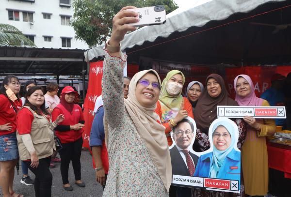 AMPANG JAYA, 15 NOV: Rodziah Ismail tiba lewat lebih 45 minit di lokasi kempen di Flat Taman Cahaya di sini kerana bergegas menyelesaikan isu air penduduk di kawasan lain.