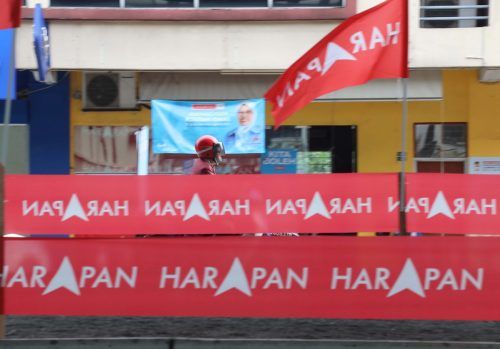 Penuggang motosikal melintasi gegantung calon Pakatan Harapan (HARAPAN) Parlimen Ampang Rodziah Ismail dan kain rentang HARAPAN di Jalan Ampang pada 15 November 2022. Foto MOHD YUSNI ARIFFIN/SELANGORKINI