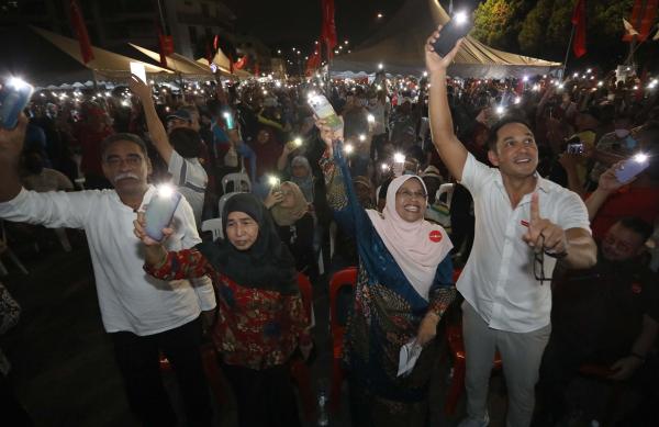 AMPANG JAYA. 17 NOV: Penyanyi rap, Altimet teruja dengan sokongan padu ribuan penduduk Ampang yang sanggup berhujan ketika ceramah calon Pakatan Harapan (HARAPAN) Ampang, Rodziah Ismail, semalam.