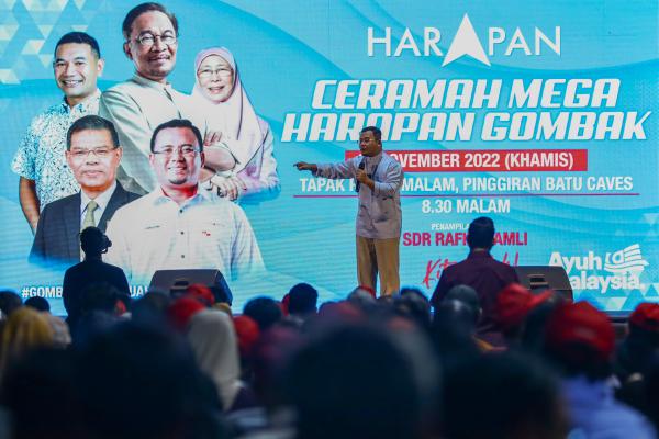 Penyokong Pakatan Harapan (HARAPAN) bersorak apabila mendengar amanat dari pimpinan HARAPAN ketika Ceramah Mega HARAPAN Gombak sempena pilihan raya umum ke-15 (PRU15) di Pinggiran Batu Caves, Gombak pada 17 November 2022. Foto HAFIZ OTHMAN/SELANGORKINI[/caption]