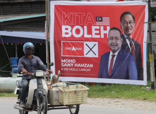 Penunggang motosikal roda tiga melintasi poster besar calon Pakatan Harapan (HARAPAN), Mohd Sany Hamzan yang di pasang berhampiran jalan utama Hulu Langat menuju ke Kampung Orang Asli Kuala Pongsun, Hulu Langat pada 18 November 2022. Foto MOHD YUSNI ARIFFIN/SELANGORKINI