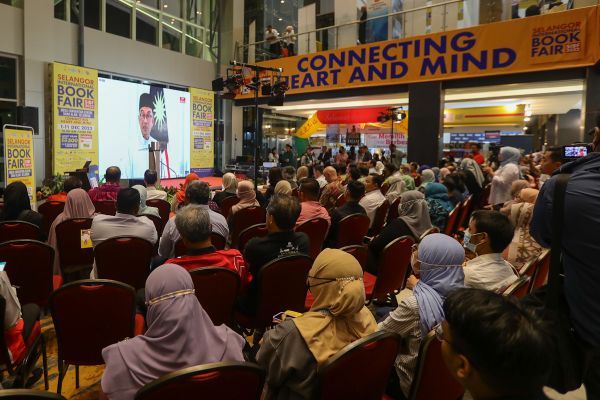 Pengunjung yang hadir ke Pesta Buku Antarabangsa Selangor 2022 (SIBF2022) mendengar pengumuman pembentukan kabinet Malaysia dari Perdana Menteri Malaysia Dato' Seri Anwar Ibrahim yang di pancarkan secara langsung di Pusat Konvensyen MBSA, Shah Alam pada 2 Disember 2022. Foto HAFIZ OTHMAN/SELANGORKINI
