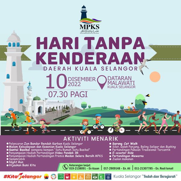 Menerusi Facebook, Majlis Perbandaran Kuala Selangor (MPKS) memaklumkan aktiviti yang dijadual bermula 7.30 pagi termasuklah kayuhan santai basikal, sarong 'cat walk' dan hijaukan bumi kita.