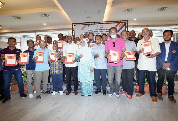 Exco Perumahan Rodziah Ismail (dua kanan) ketika sesi menandatangani majlis cabutan undi unit dan perjanjian penyerahan hartanah kepada 26 bekas pemain bola sepak Selangor yang memenangi Piala Malaysia 1995 di ruang legar di bangunan pentadbiran Kerajaan Negeri di Shah Alam pada 8 Disember 2022. Foto NUR ADIBAH AHMAD IZAM/SELANGORKINI[/caption]