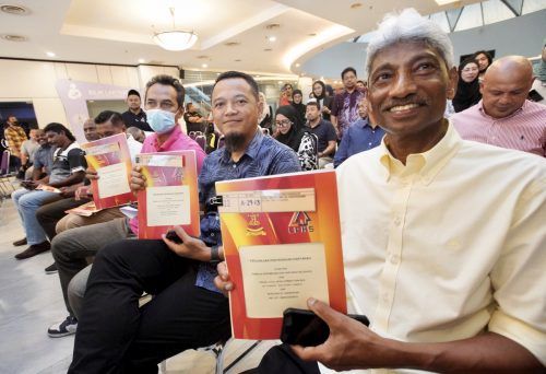 Datuk K Rajagopal (kanan) dan bekas rakan pasukan menunjukkan perjanjian penyerahan hartanah sempena majlis cabutan undi unit dan menandatangani perjanjian penyerahan hartanah kepada 26 bekas pemain bola sepak Selangor yang memenangi Piala Malaysia 1995 di Foyer Bangunan Sultan Salahuddin Abdul Aziz Shah, Shah Alam pada 8 Disember 2022. Foto NUR ADIBAH AHMAD IZAM/SELANGORKINI