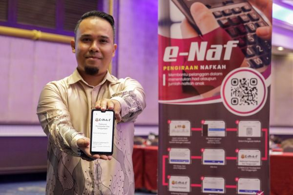 Pegawai Syariah Negeri Selangor Mohd Khairi Kamis menunjukkan sistem pengiraan nafkah e-Naf melalui laman web Jabatan Kehakiman Syariah Selangor ketika majlis pelancaran sistem e-Naf di Hotel Mardhiyyah, Shah Alam pada 15 Disember 2022. Orang ramai yang ingin menggunakan boleh melayari http://enaf.jakess.gov.my/ . Foto FIKRI YUSOF/SELANGORKINI