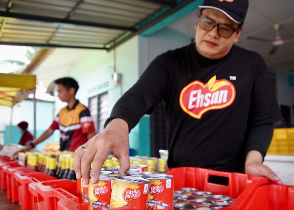 Petugas PKPS, Baha Rudin Mat Rifin menyusun barangan Jualan program Jelajah Ehsan Rakyat di Dewan Harmoni Seksyen 19, Shah Alam pada 18 Disember 2022. Foto/NUR ADIBAH AHMAD IZAM