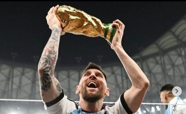 Foto itu menyaksikan Messi menjulang trofi Piala Dunia sambil meraikan kemenangan gemilang Argentina ke atas juara bertahan Perancis.