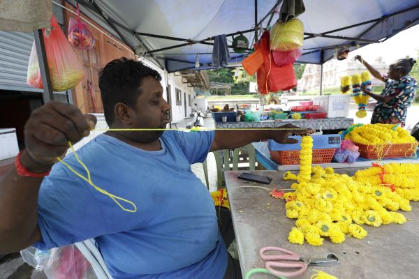 Ramesh Muthumaran, 41, (kiri) bersama ibunya Eswary Pachepen, 64, membuat kalung bunga untuk jualan di hadapan Kuil Sri Shakthi Dhevasthanam, Kuala Selangor pada 20 Disember 2022. Foto FIKRI YUSOF/SELANGORKINI