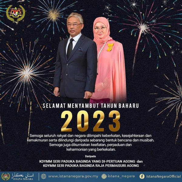 KUALA LUMPUR, 31 DIS: Yang di-Pertuan Agong Al-Sultan Abdullah Ri'ayatuddin Al-Mustafa Billah Shah dan Raja Permaisuri Agong Tunku Hajah Azizah Aminah Maimunah Iskandariah menzahirkan ucapan Selamat Tahun Baharu 2023 dan mendoakan perpaduan dan keharmonian negara terus berkekalan.