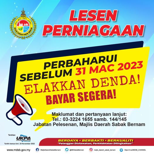 SHAH ALAM, 7 JAN: Majlis Daerah Sabak Bernam (MDSB) meminta peniaga di daerah itu memperbaharui lesen perniagaan masing-masing.