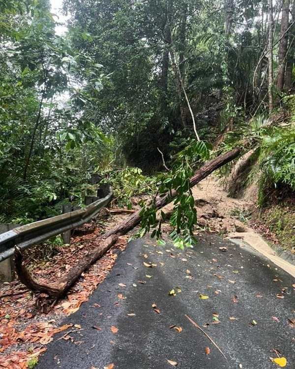 Kejadian jam 3 petang itu mengakibatkan laluan utama kawasan itu terhalang dengan pokok tumbang dan tanah.