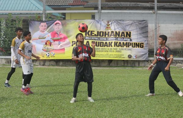 Pemain pasukan KIDaS Al-Hidayah menanduk bola ketika bertemu pemain pasukan MFU FC dalam pelawanan akhir bole sepak bawah 12 tahun di Kejohanan Piala Budak Kampung 2023 kejohanan siri keempat di Stadium Mini Paya Jaras, Sungai Buloh pada 15 Januari 2023. Foto MOHD YUSNI ARIFFIN/SELANGORKINI