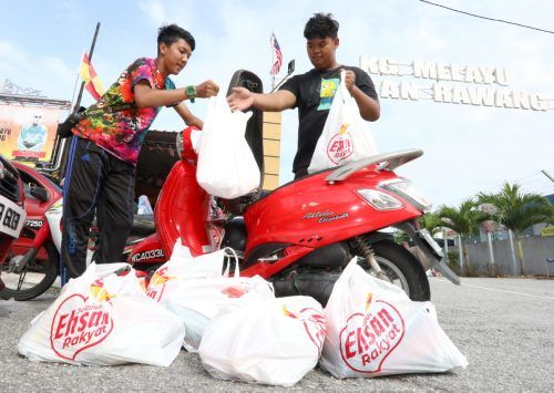 Dua sahabat Suhairil Sulaiman (kiri) dan Farid Razis membeli barangan keperluan asas yang dijual lebih murah berbanding harga pasaran pada Program Jelajah Ehsan Rakyat DUN Rawang di Dewan MPPK Kampung Melayu, Rawang pada 30 Januari 2023. Foto MOHD YUSNI ARIFFIN/SELANGORKINI