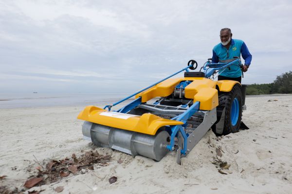 Kontraktor pembersihan pantai morib Rosli Kamsah, 50, menggunakan mesin 'walk beach comber' ketika majlis pelancaran jentera pembersihan pantai dan penyerahan tong sampah bagi kawasan Morib di Pantai Morib pada 31 Januari 2023. Foto FIKRI YUSOF/SELANGORKINI
