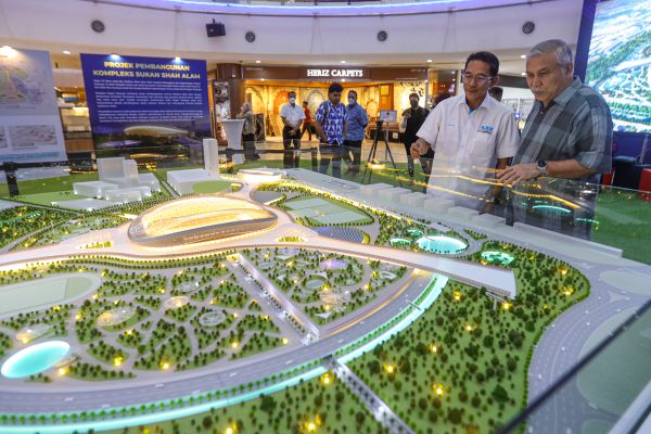 Pengurus Besar Unit Projek Khas MBI Datuk Ir Ruslan Abdul Aziz (kiri) bersama Presiden Eksekutif Malaysian Resources Corporation Berhad (MRCB) Datuk Dell Akbar Khan Hyder Khan (kanan) membincangkan model konsep awal pembangunan Kompleks Sukan Shah Alam kepada media ketika di temuramah Media Selangor di pusat beli belah SACC Mall, Shah Alam pada 1 Februari 2023. Foto HAFIZ OTHMAN/SELANGORKINI