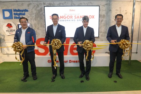 EXCO Perindustrian dan Perdagangan Dato' Teng Chang Khim (dua,kiri), Duta Besar Amerika Syarikat Brian D Mc Feeters (dua,kanan), Ketua Pegawai Eksekutif (CEO) Perbadanan Teknologi Maklumat Ekonomi Digital Selangor (Sidec) Yong Kai Ping (kiri) serta CEO Invest Selangor Berhad Dato' Hasan Azhari Idris (kanan) memotong riben sebagai gimik perasmian ruang kerja warga Selangor Sandbox di Pusat Kreatif Digital Selangor, i-City Shah Alam pada 14 Februari 2022. Foto REMY ARIFIN/SELANGORKINI
