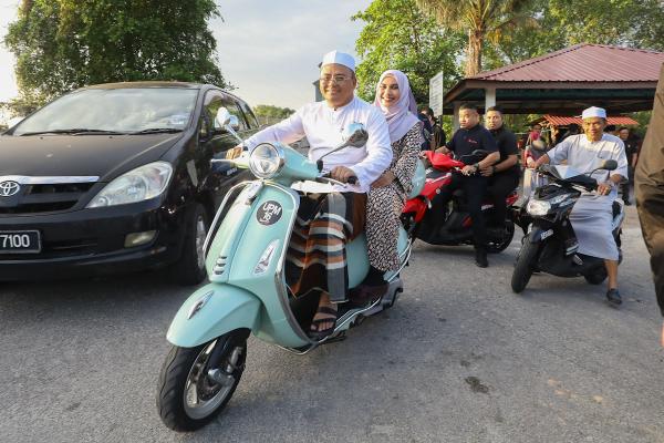 Layanan Yusoff terhadap pelanggan terhenti seketika sebaik melihat kemunculan Dato’ Menteri Besar Dato’ Seri Amirudin Shari bersama isteri Datin Seri Masdiana Muhamad yang menunggang motosikal jenis Vespa.