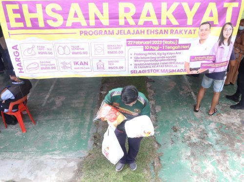 Orang ramai membeli barangan keperluan asas dengan harga yang murah pada Program Jelajah Ehsan Rakyat DUN Bandar Utama di Kampung Sungai Kayu Ara, Petaling Jaya pada 22 Februari 2023. Foto MOHD YUSNI ARIFFIN/SELANGORKINI