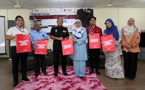 Ketua Eksekutif Yayasan Sinar Untuk Malaysia Rasuah Busters Norhayati Nordin (empat, kanan) menyampaikan cenderamata kepada Ketua Penolong Kanan Pesuruhjaya Suruhanjaya Pencegahan Rasuah Malaysia (SPRM) Ab Muneim Ibrahim (tiga, kiri) pada Forum Bual Bicara Rasuah Membarah, Negara Pasti Musnah di Dewan MPKK Kampung Melayu Wira Damai, Gombak pada 22 Februari 2023. Foto AHMAD ZAKKI JILAN/SELANGORKINI