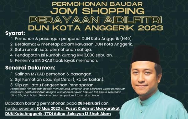 PETALING JAYA, 2 MAC: Warga Dewan Undangan Negeri (DUN) Kota Anggerik beragama Islam kini boleh memohon Baucar Jom Shopping Aidilfitri bernilai RM200.