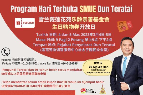 "Untuk SMUE hanya warga emas yang telah mendaftar di DUN Teratai lebih tiga bulan dan belum mengambil baucar perlu datang," jelasnya.