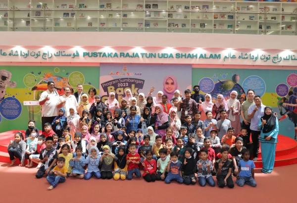 Yang Dipertua Pekawanis Datin Seri Masdiana Muhamad bersama antara murid yang menerima bantuan kembali ke sekolah di Perpustakaan Raja Tun Uda, Shah Alam pada 6 Mac 2023. Foto Facebook Pekawanis[/caption]