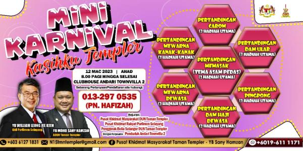 SELAYANG, 9 MAC: Dewan Undangan Negeri (DUN) Taman Templer menganjurkan Mini Karnival Kasihku Templer sempena cuti sekolah di Clubhouse Andari Townvilla 2, Batu Caves pada Ahad, 12 Mac ini.