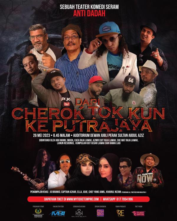 SHAH ALAM, 14 MAC: Pementasan teater ‘Dari Cherok Tok Kun Ke Putrajaya’ yang mengangkat tema komedi seram memerangi penyalahgunaan dadah akan dipentaskan di Auditorium Dewan Jubli Perak Sultan Abdul Aziz di sini.