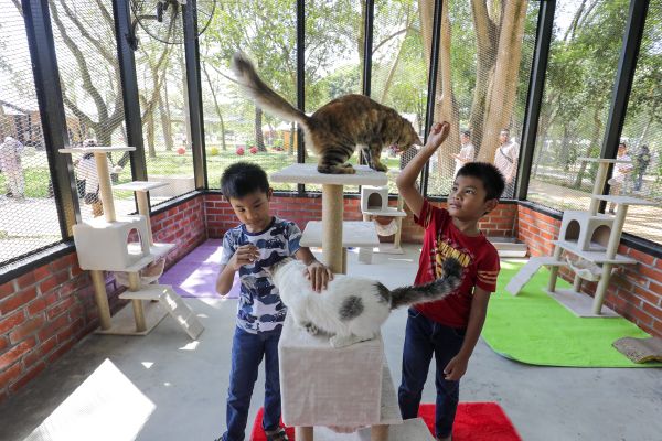 Adik-beradik kembar, Adam Shafiy Mohd Shafizol, 8, (kanan) bersama Ammar Sufi Mohd Shafizol, 8, bermain kucing jalanan di Taman Kucing Cyberjaya, Sepang pada pada 18 Mac 2023. Taman kucing Cyberjaya dibina bertujuan untuk memberi perlindungan kepada kucing terbiar di sekitar daerah Sepang bagi memastikan haiwan itu terpelihara dan tidak berkeliaran. Ia juga merupakan satu transit bagi kucing terbiar yang mempunyai peluang untuk dijadikan haiwan kesayangan bagi mereka yang berminat. Taman kucing berkenaan dapat menempatkan kira-kira 300 kucing pada satu-satu masa dan dilengkapi dengan sebuah pejabat, klinik, ruang istirahat termasuk unit rawatan rapi, unit pemulihan serta unit rawatan kucing. Foto FIKRI YUSOF/SELANGORKINI