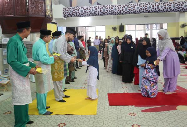 Sebahagian anak yatim kelihatan ceria menerima sumbangan Aidilfitri Yayasan Islam Darul Ehsan (Yide) yang disampaikan Duli Yang Teramat Mulia (DYTM) Raja Muda Selangor Tengku Amir Shah di Masjid Kampung Raja Uda, Pelabuhan Klang, Klang pada 25 Mac 2023. Foto AHMAD ZAKKI JILAN/SELANGORKINI[/caption]