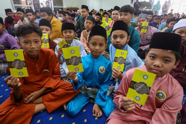 Sebahagian anak yatim kelihatan ceria menerima sumbangan Aidilfitri Yayasan Islam Darul Ehsan (Yide) yang disampaikan Duli Yang Teramat Mulia (DYTM) Raja Muda Selangor Tengku Amir Shah di Masjid Kampung Sungai Terap, Kuala Selangor pada 26 Mac 2023. Foto HAFIZ OTHMAN/SELANGORKINI