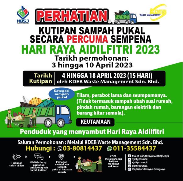 SHAH ALAM, 27 MAC: Majlis Bandaraya Subang Jaya (MBSJ) menawarkan perkhidmatan kutipan sampah pukal secara percuma bagi kawasan perumahan teres sempena Aidilfitri.