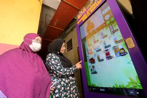 Dzabedah Alisman, 60 (kanan) dan Jubaidah Tarmidi, 61, menggunakan mesin layan diri makanan khusus untuk golongan B40 di Rumah Pangsa Kayu Ara, Petaling Jaya pada 27 Mac 2023. Foto AHMAD ZAKKI JILAN/SELANGORKINI